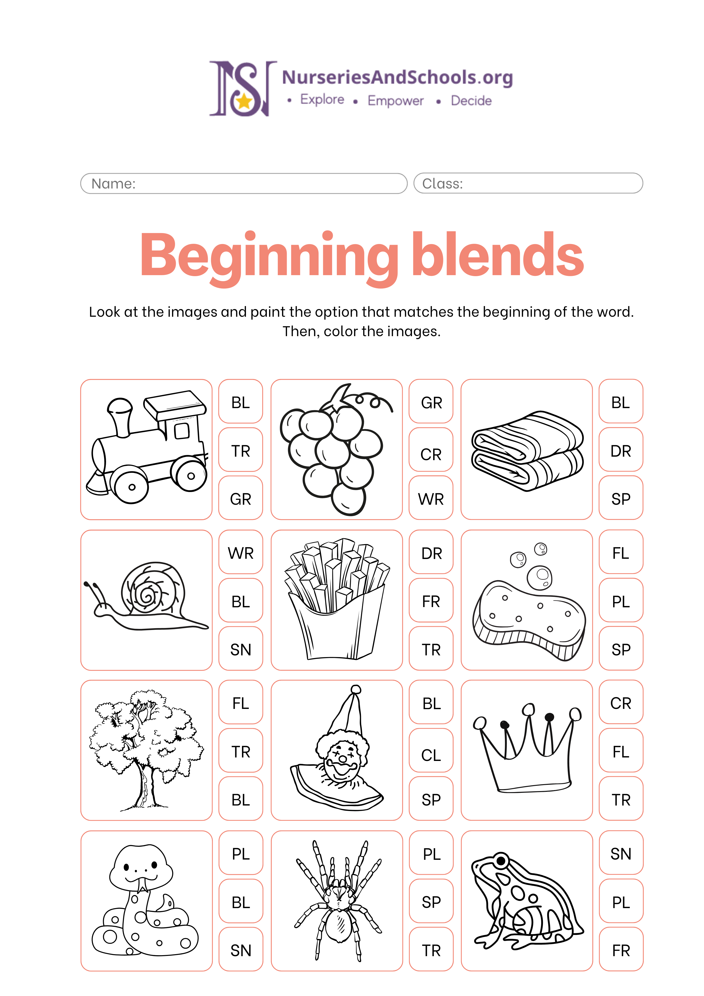 Look at the images and paint the option that matches the beginning of the word. Then, color the images.