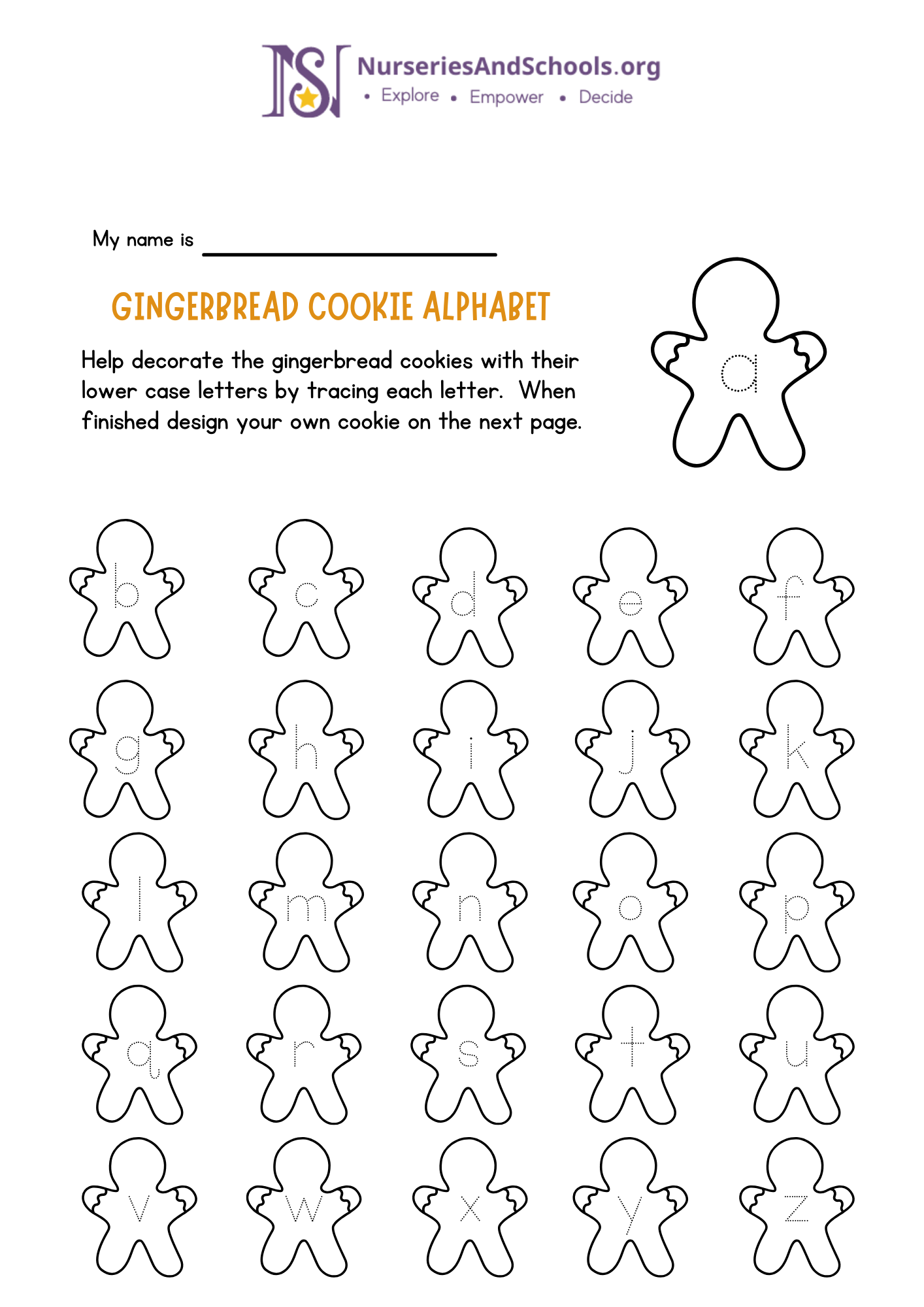 Help decorate the gingerbread cookies with their lowercase letters by tracing each letter. When finished ,design your own cookie on the next page.
