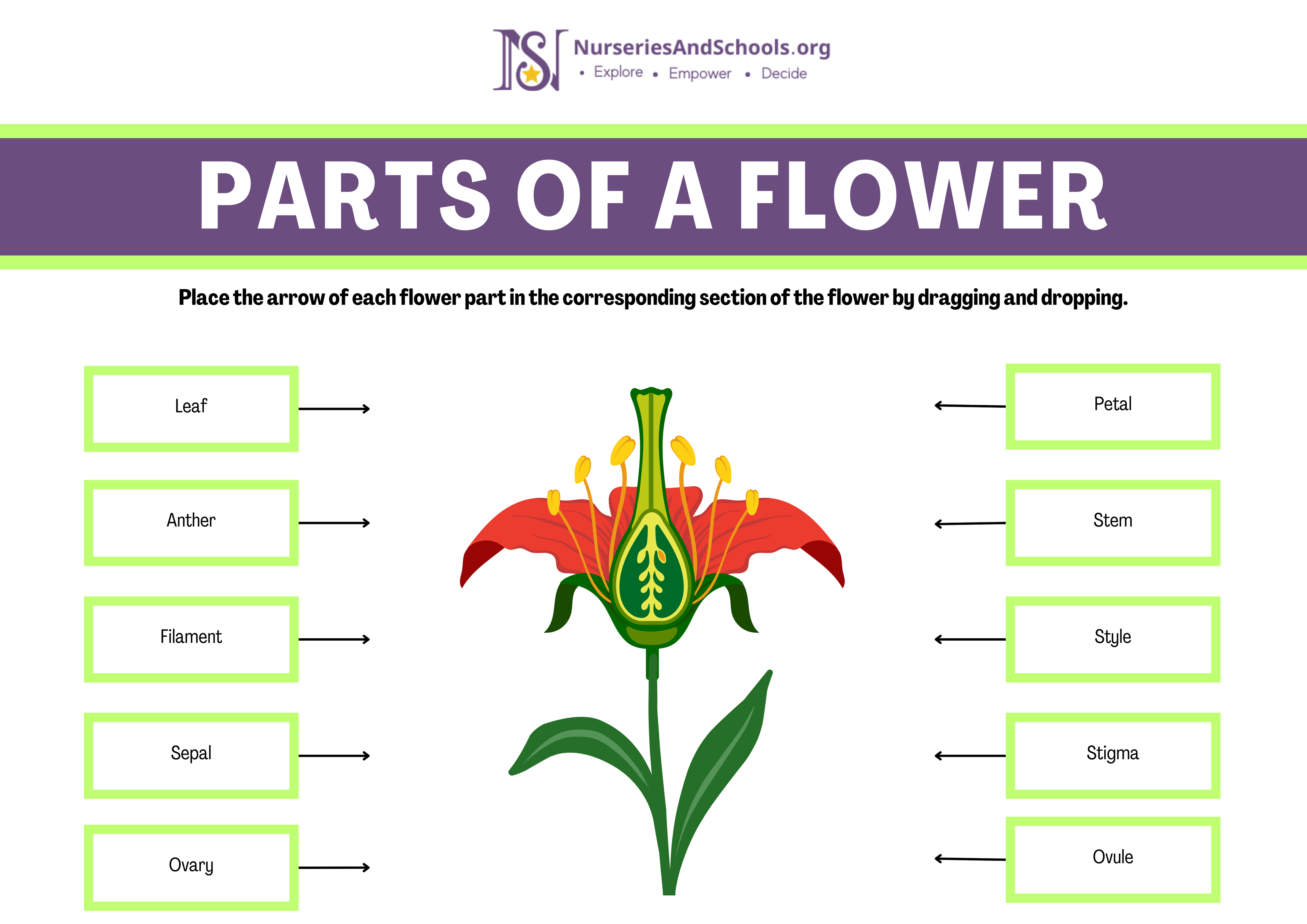 Place the arrow of each flower part in the corresponding section of the flower by dragging and dropping.